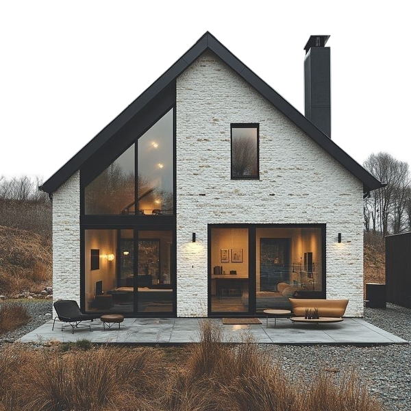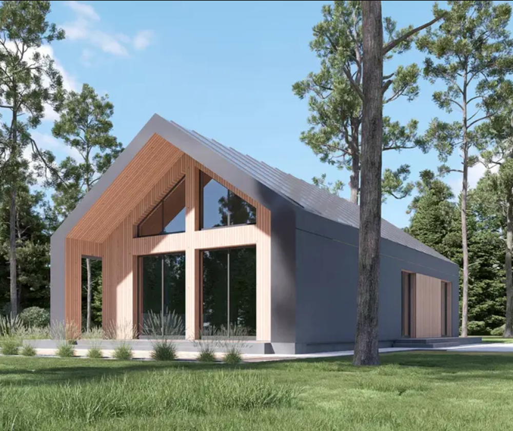 Одноэтажный дом с двускатной крышей, просторной гостиной с камином и выходом на террасу.