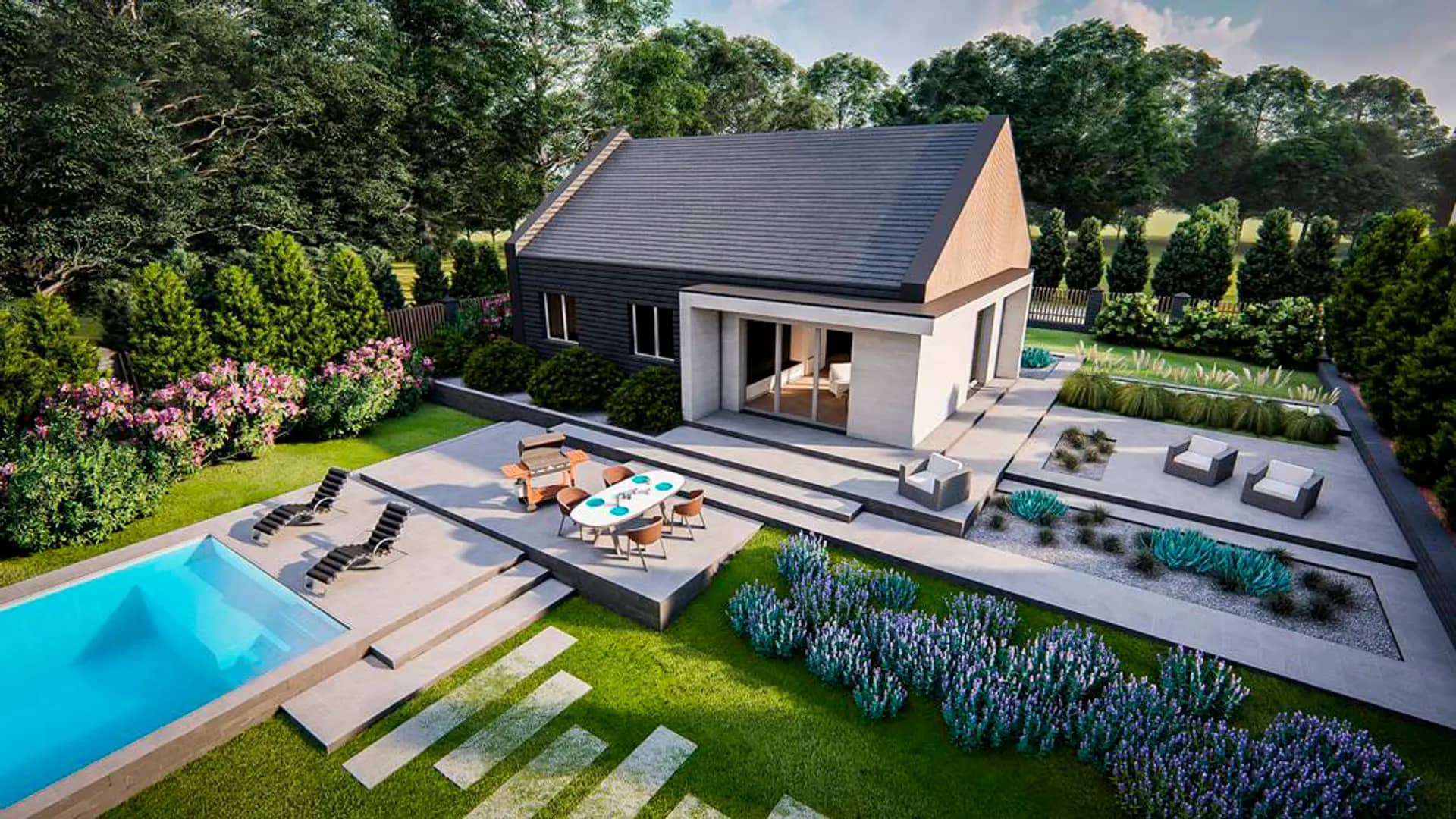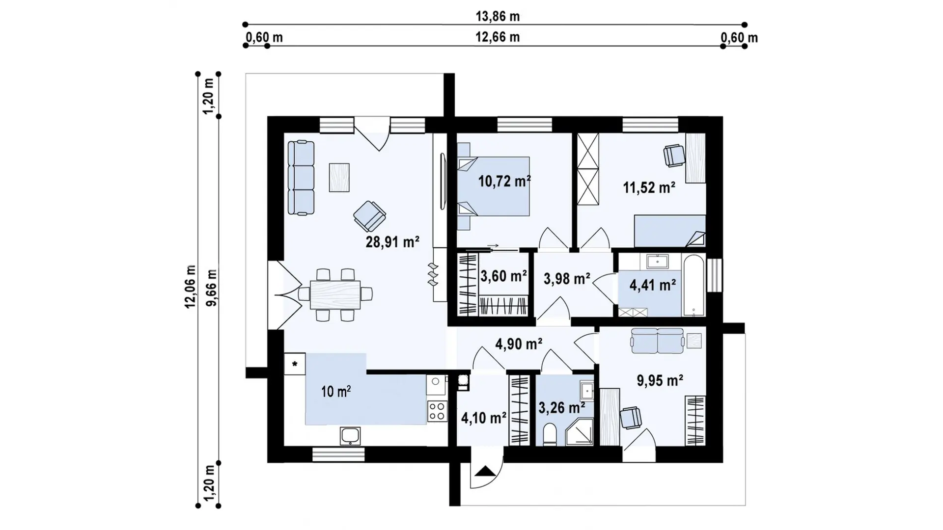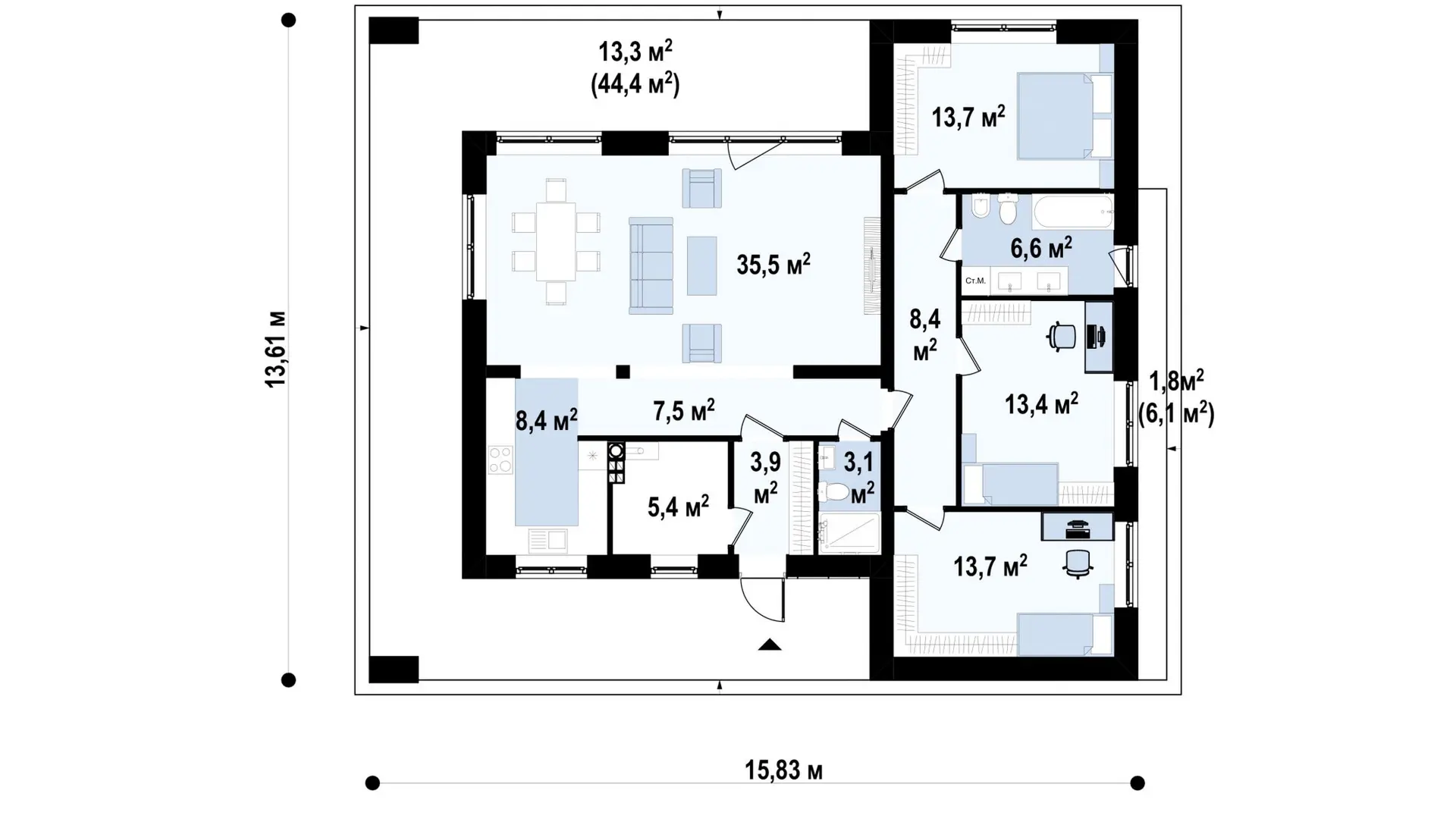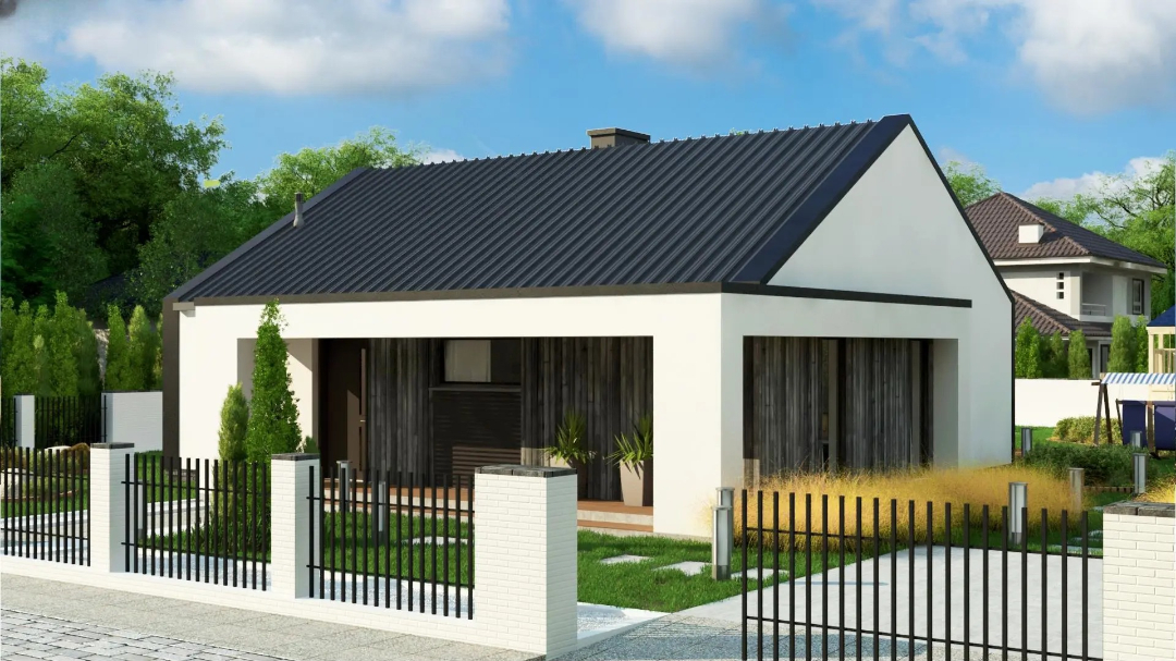 Современный одноэтажный дом с 3 спальнями, идеально подходящий для семьи из 4 человек.