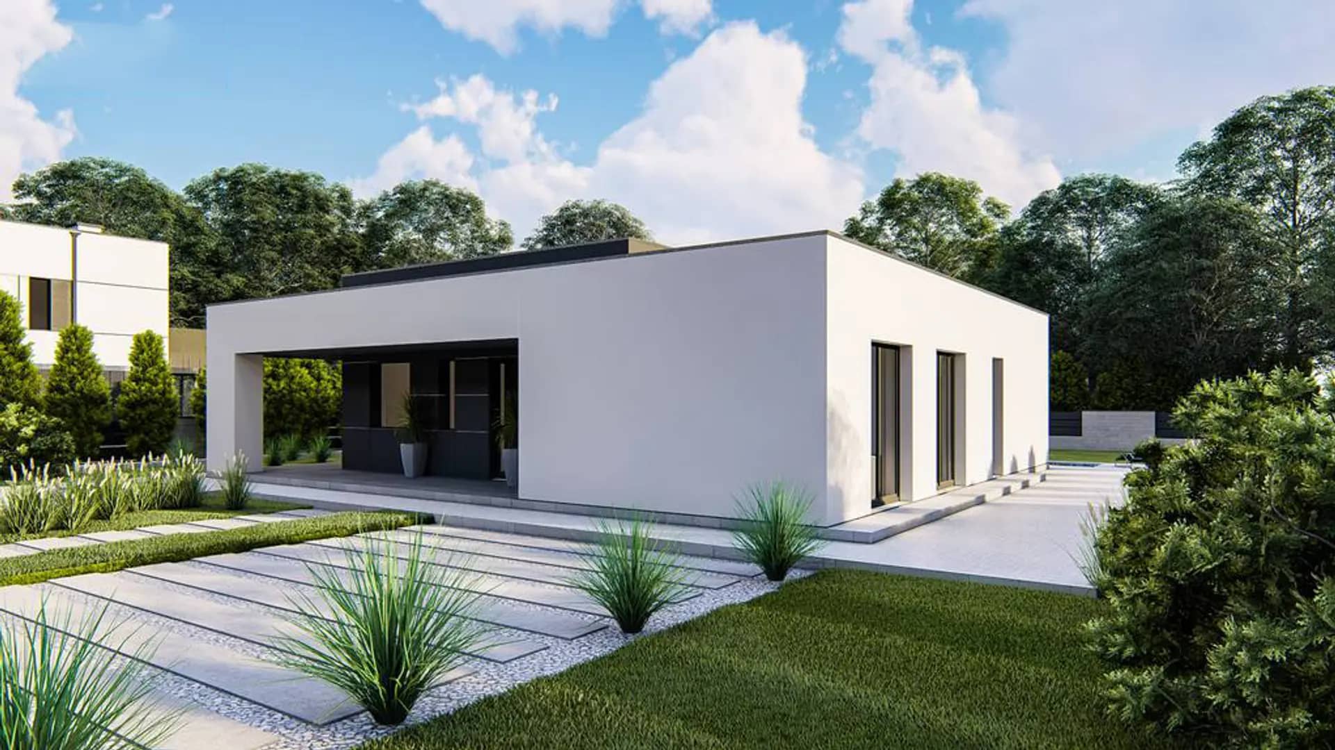 Стильный одноэтажный дом с плоской крышей и просторной террасой для отдыха.