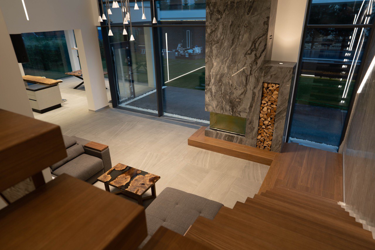 Камин в центре гостиной наполняет дом атмосферой уюта, а выход на террасу из каждой спальни делает отдых на свежем воздухе особенно комфортным.