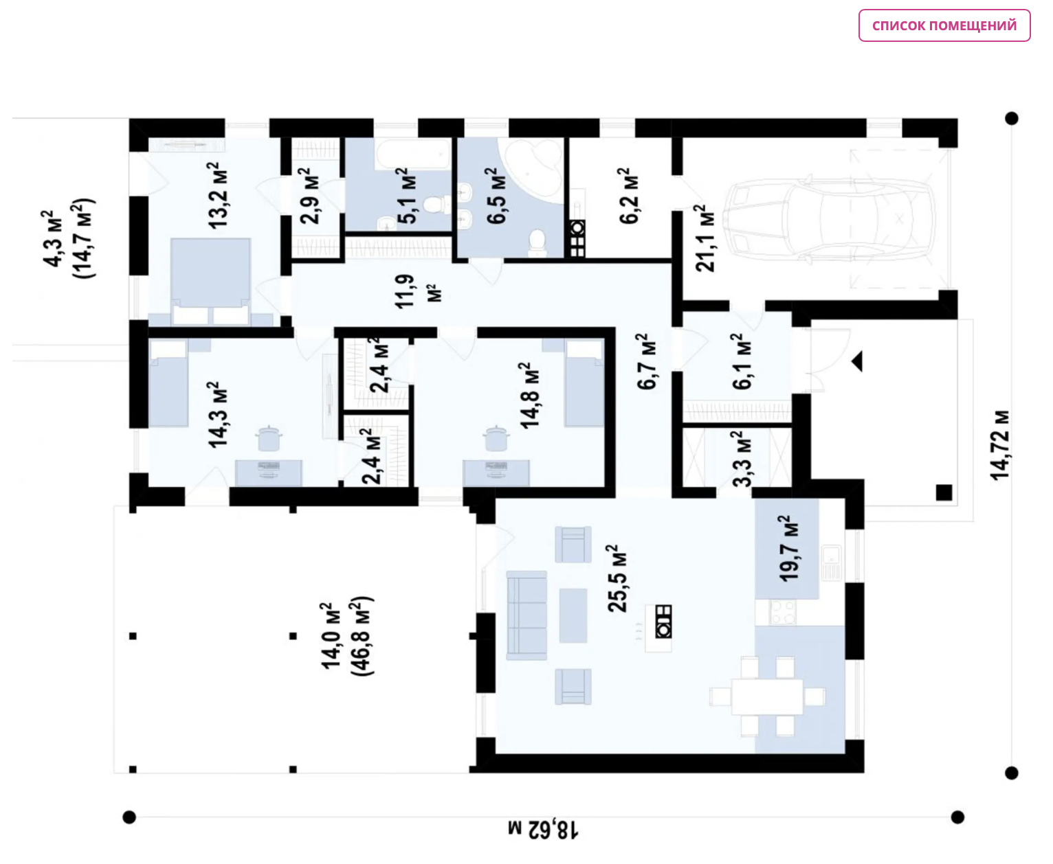 Большой одноэтажный дом для семьи, которой важны простор и функциональность.